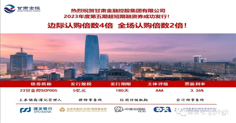 2023年12月14日,甘肅金控集團(tuán)成功發(fā)行2023年度第五期超短期融資券,發(fā)行規(guī)模5億元,債券期限180天,票面利率3.36%。本次債券發(fā)行獲得了銀行、券商、公募基金等金融機(jī)構(gòu)的踴躍認(rèn)購(gòu),邊際認(rèn)購(gòu)倍數(shù)4倍,全場(chǎng)認(rèn)購(gòu)倍數(shù)2倍。