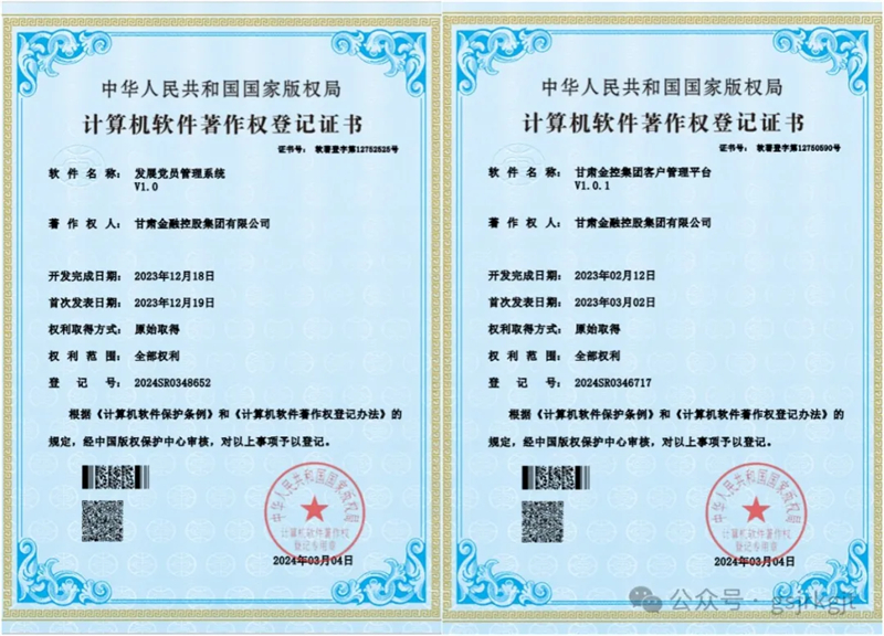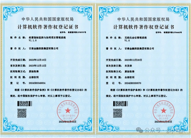 近日,甘肅金控集團(tuán)獲得“無紙化會(huì)議管理系統(tǒng)”、“客戶管理平臺(tái)”、“經(jīng)營(yíng)指標(biāo)監(jiān)控與協(xié)同項(xiàng)目管理系統(tǒng)”和“發(fā)展黨員管理系統(tǒng)”四項(xiàng)計(jì)算機(jī)軟件著作權(quán)登記證書。本次獲得證書的軟件系統(tǒng)是集團(tuán)在行政辦公、經(jīng)營(yíng)管理和黨建信息化建設(shè)方面的最新成果,標(biāo)志著集團(tuán)信息技術(shù)能力邁上新臺(tái)階。