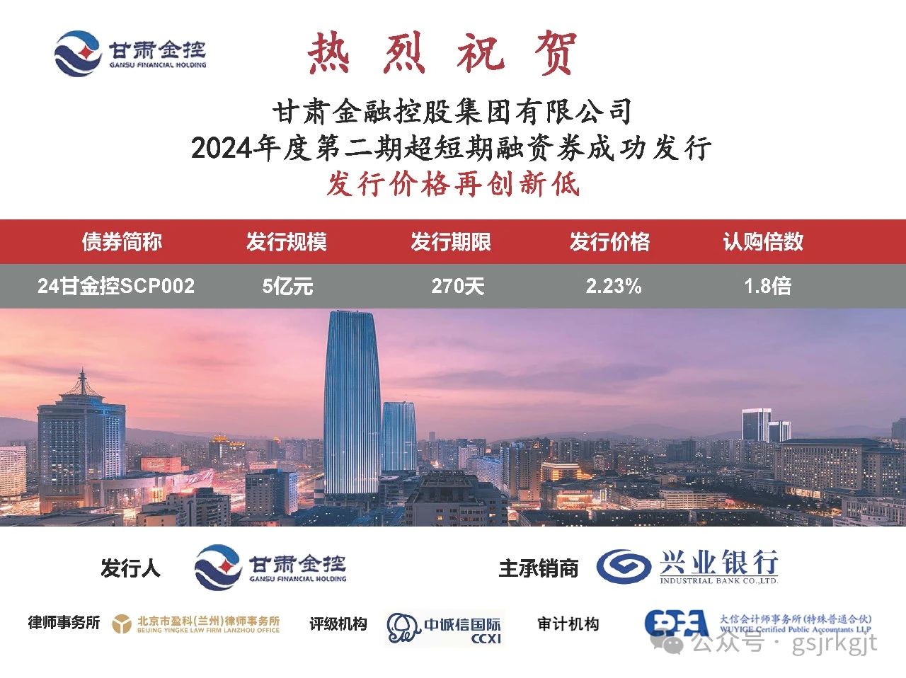 2024年6月4日,甘肅金融控股集團有限公司成功發(fā)行2024年度第二期超短期融資券,發(fā)行規(guī)模5億元,債券期限270天,票面利率2.23%,再創(chuàng)發(fā)行超短期融資券利率新低。