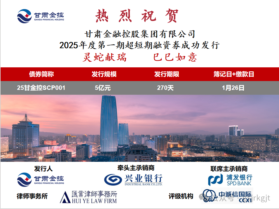 2025年1月26日,甘肅金控集團(tuán)成功發(fā)行2025年度第一期超短期融資券,規(guī)模5億元,期限270天。本筆項(xiàng)目是乙巳蛇年春節(jié)前全國最后一筆公開發(fā)行債券,受到了交易商協(xié)會(huì)、北金所、市場(chǎng)投資人的特別關(guān)注,有力提高了集團(tuán)的市場(chǎng)知名度,也為集團(tuán)后續(xù)債券發(fā)行開了好頭!