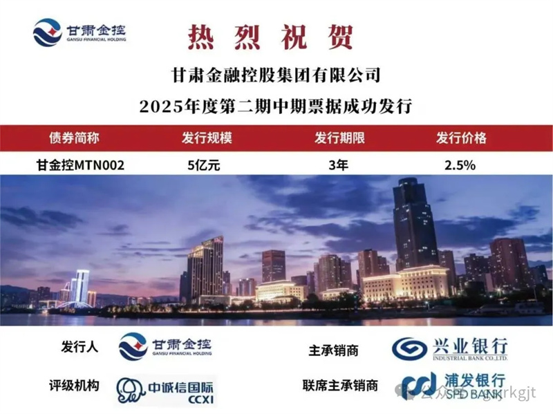 2025年10月17日,甘肅金控集團(tuán)成功發(fā)行2025年度第二期中期票據(jù)。發(fā)行規(guī)模5億元,期限3年,票面利率2.5%。票據(jù)發(fā)行過程中,吸引了多家商業(yè)銀行、信托公司等機(jī)構(gòu)投資者積極參與,充分體現(xiàn)了資本市場對(duì)甘肅金控集團(tuán)綜合實(shí)力、戰(zhàn)略布局和發(fā)展前景的認(rèn)可,本次中期票據(jù)發(fā)行成功為集團(tuán)的持續(xù)發(fā)展提供有力的資金保障。