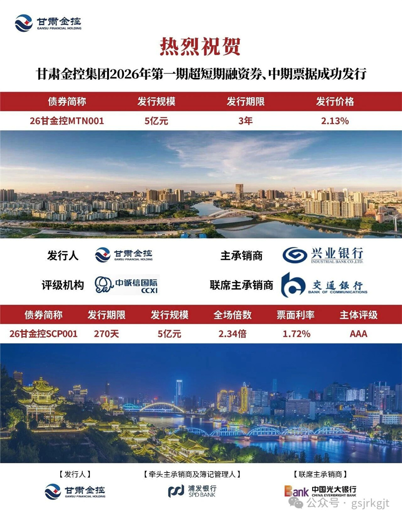 近日,甘肅金控集團(tuán)成功發(fā)行2026年第一期超短期融資券,規(guī)模5億元,期限270天,票面利率1.72%,創(chuàng)集團(tuán)債券發(fā)行利率歷史新低;同期成功發(fā)行2026年第一期中期票據(jù),發(fā)行規(guī)模5億元,期限3年,票面利率2.13%,刷新集團(tuán)中期票據(jù)發(fā)行利率最低記錄。