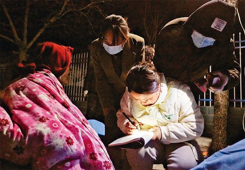 2023年12月19日,在甘肅省積石山縣中西醫(yī)結(jié)合醫(yī)院門口,當(dāng)?shù)馗刹吭诘怯浭転?zāi)群眾信息。18日23時59分,甘肅省臨夏回族自治州積石山保安族東鄉(xiāng)族撒拉族自治縣發(fā)生6.2級地震。(新華社記者?馬希平/攝)
