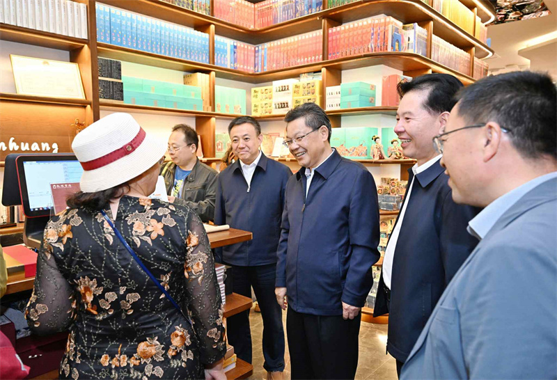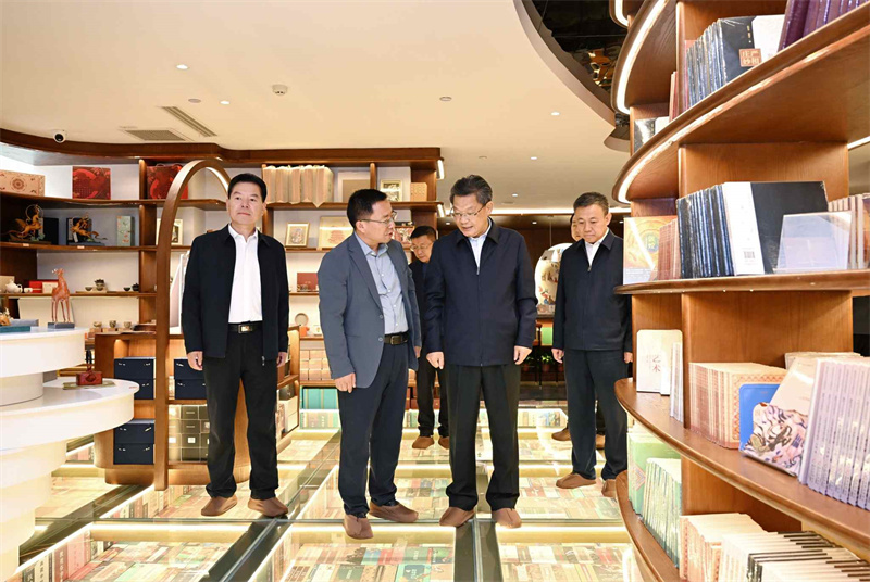 任振鶴先后來(lái)到敦煌印局、敦煌無(wú)界、敦煌書(shū)局和敦煌集·非遺文化街區(qū),詳細(xì)了解文化產(chǎn)業(yè)發(fā)展和非遺文化街區(qū)建設(shè)等情況。他指出,敦煌文化延續(xù)近兩千年,是世界現(xiàn)存規(guī)模最大、延續(xù)時(shí)間最長(zhǎng)、內(nèi)容最豐富、保存最完整的藝術(shù)寶庫(kù)。要不斷擦亮敦煌文化名片,圍繞建設(shè)世界文化遺產(chǎn)保護(hù)的典范和敦煌學(xué)研究高地,把握傳承和創(chuàng)新的關(guān)系,找準(zhǔn)契合處、聯(lián)結(jié)點(diǎn),加快業(yè)態(tài)融合、產(chǎn)品融合、市場(chǎng)融合、服務(wù)融合,在更高起點(diǎn)、更高層次、更高目標(biāo)上讓敦煌文化“活起來(lái)”“潮起來(lái)”,為現(xiàn)代化建設(shè)提供有力文化支撐。