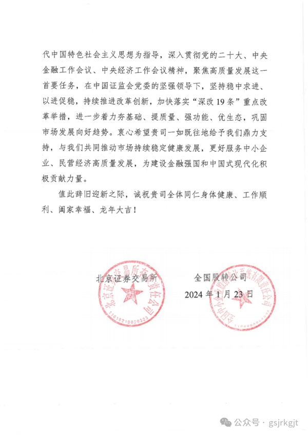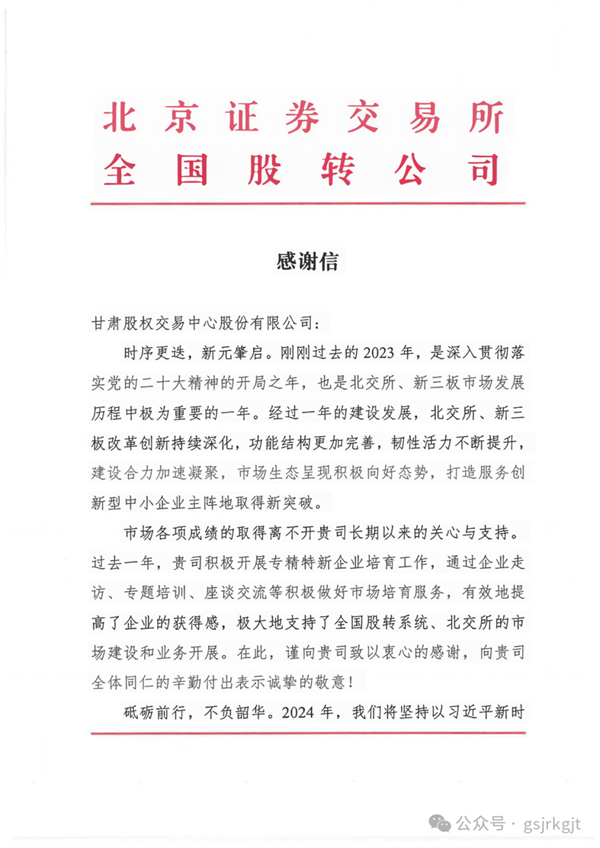 新春到來之際,甘肅股權(quán)交易中心喜獲北交所、全國股轉(zhuǎn)公司發(fā)來的感謝信。2023年,是甘肅股權(quán)交易中心與北交所、全國股轉(zhuǎn)公司深化合作的一年,“北交所、全國股轉(zhuǎn)系統(tǒng)甘肅服務(wù)基地”揭牌、與全國股轉(zhuǎn)公司簽訂《監(jiān)管合作備忘錄》啟動(dòng)新三板掛牌“綠色通道”便利機(jī)制,聯(lián)合開展北交所“三服務(wù)”甘肅行活動(dòng),走訪、座談、一對(duì)一診斷、培訓(xùn)企業(yè)百余家,基本實(shí)現(xiàn)省內(nèi)市州及蘭州新區(qū)全覆蓋,北交所改革東風(fēng)吹向隴原大地,為甘肅資本市場高質(zhì)量發(fā)展帶來了新的歷史機(jī)遇。