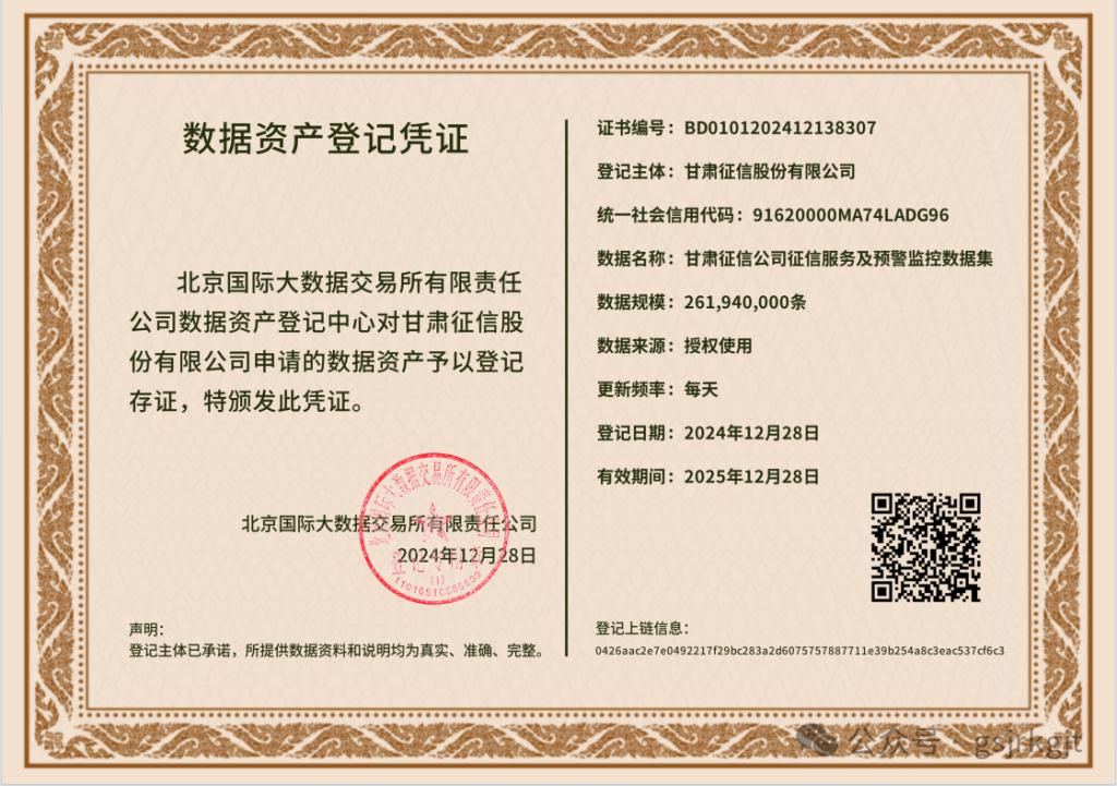 近日,甘肅征信成功完成首單數(shù)據(jù)資產(chǎn)入表工作。“甘肅征信公司征信服務及預警監(jiān)控數(shù)據(jù)集” 數(shù)據(jù)產(chǎn)品順利通過北京國際大數(shù)據(jù)交易所審核公示,取得數(shù)據(jù)資產(chǎn)登記憑證(證書編號:BD0101202412138307),成為甘肅省省內首例以征信數(shù)據(jù)實現(xiàn)數(shù)據(jù)資產(chǎn)入表的省屬國有企業(yè)。